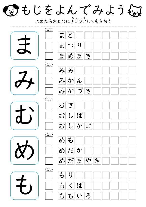 【無料】ひらがな読み「まみむめも」練習プリント|2〜3歳向け