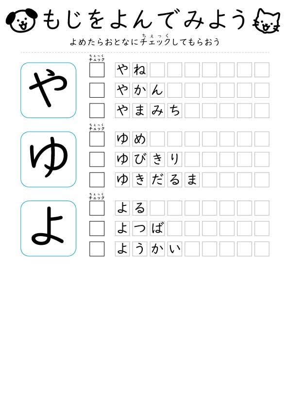 【無料】ひらがな読み「やゆよ」練習プリント|2〜3歳向け
