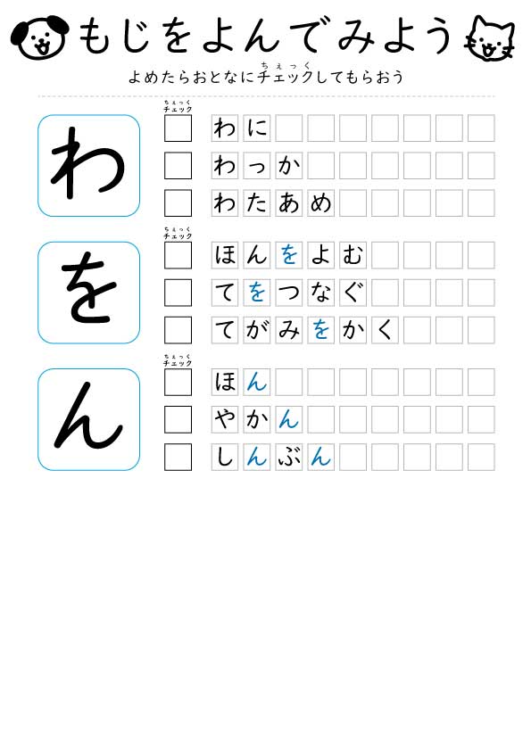 【無料】ひらがな読み「わをん」練習プリント|2〜3歳向け