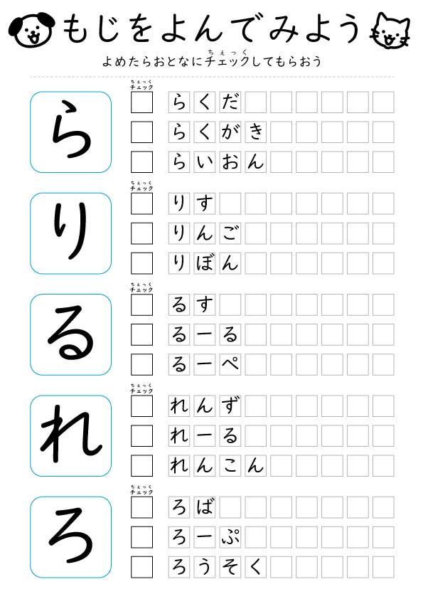 【無料】ひらがな読み「らりるれろ」練習プリント|2〜3歳向け